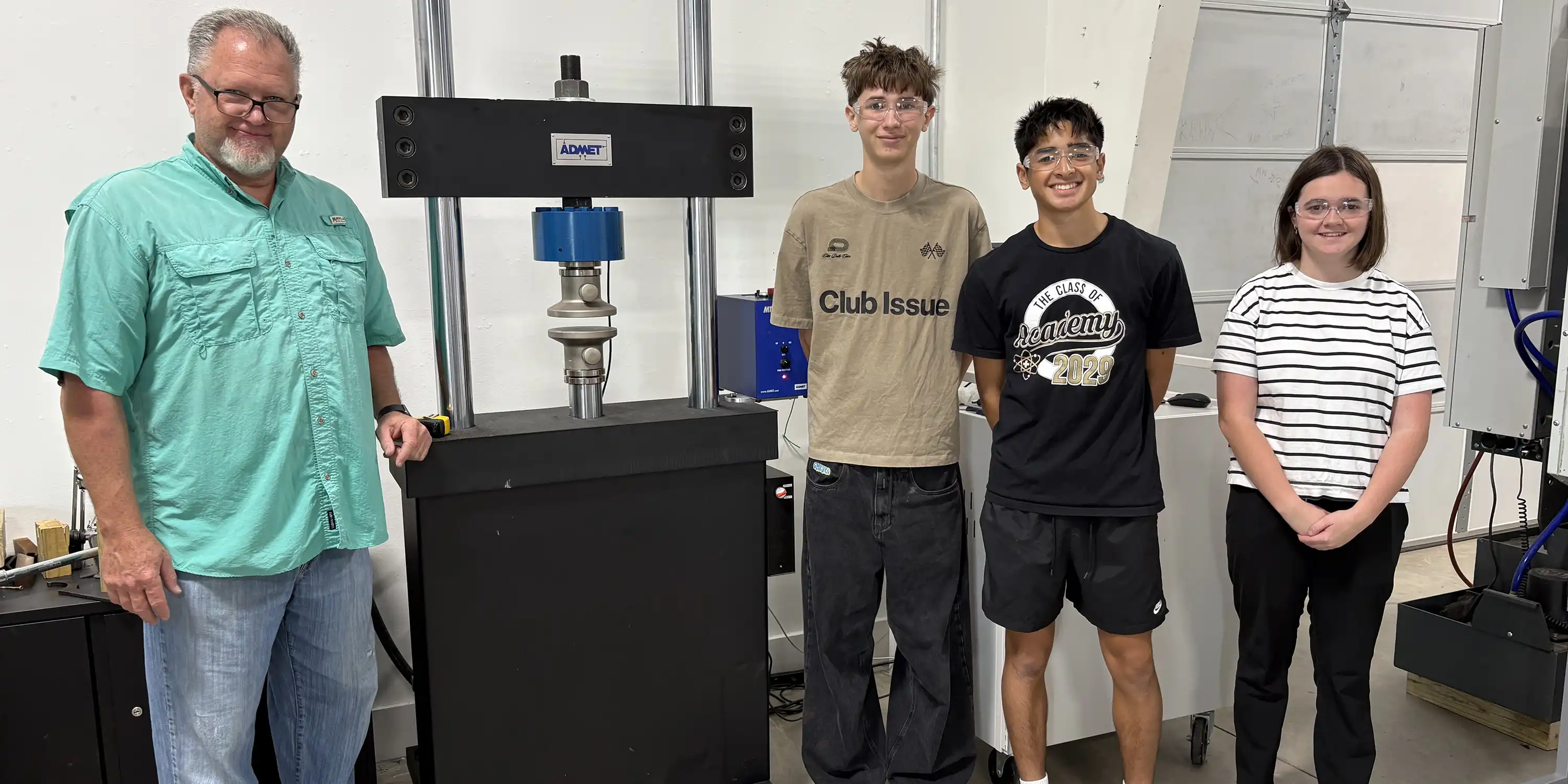 During their visit with the SHSU Engineering Department, Conroe ISD students Blake Lantagne, Evan McCoy, and Elliot Swiney explored real-world engineering by testing lunar regolith–based concrete designed to support future construction on the moon. Their project focused on reducing materials needed from Earth by experimenting with regolith mixtures that incorporated powdered plastic, xanthan gum, and corn starch as fillers. Using our ADMET machine, the students evaluated the maximum load their samples could withstand, discovering that one brick supported more than 5,800 pounds, far exceeding what they were able to test using previous classroom methods. The experience challenged them to refine their construction process, particularly finding the right balance of water to ensure strength and durability, and required collaboration, research, and guidance from professors and mentors. Working with professional-grade equipment gave the students a new perspective on engineering, helping them see themselves as problem-solvers and innovators. Inspired by the hands-on experience, the team plans to continue exploring engineering and encourages other students to pursue their ideas, emphasizing that creativity and persistence are key to success in the field. When asked what advice they would give to other students their age, they responded, “Don’t give up on a project before you have even started. You will find solutions along the way that will keep you going-much like a real engineer. Don’t wait until the “right time’, because the right time may never come if you don’t make it happen.”